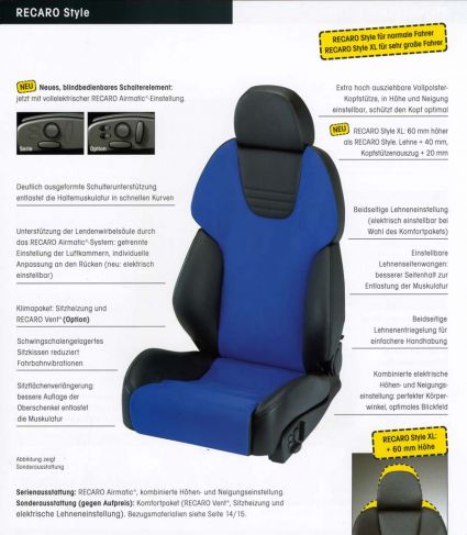 Form and function - die perfekte Symbiose aus Komfort und Design.Der RECARO Style begeistert anspruchsvolle Individualisten, für die Lebensart nicht an der Autotüre aufhört: Zukunftsweisende Technik, höchster Komfort und optimale Sicherheit - verpackt in sportlich attraktivem Design.