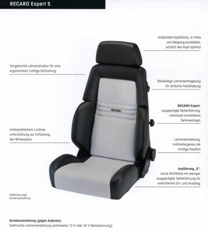 Der Experte für mobiles Sitzen - Ausführung "S".Der mit individuell einstellbaren Lehnenseitenwangen ausgestattete RECARO Expert S eignet sich mit seiner kurzen Sitzfläche mit weniger ausgeprägter Seitenführung besonders für kleine bis mittelgroße Personen.