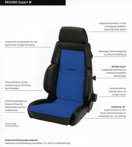 Der Experte für mobiles Sitzen - Ausführung "M".Wie der RECARO Expert S ist auch der Expert M mit individuell einstellbaren Lehnenseitenwangen ausgestattet. Die lange und sehr flache Sitzfläche eignet sich besonders für mittelgroße bis große Personen, für Fahrer, die häufig ein- und aussteigen müssen und für Fahrzeuge mit hohem Ein- und Ausstieg (z.B. Geländewagen, Vans).