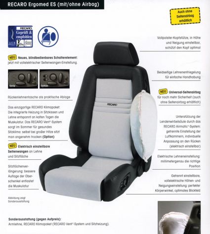 Komfort, Sicherheit und Ergonomie der Extra-Klasse.Mehr Komfort bietet Ihnen keiner: Der RECARO Ergomed ES ist das Top-Modell der RECARO Produkt-Linie. Er ist der weltweit erste Nachrüstsitz mit Universal-Seitenairbag für noch mehr Sicherheit. Für Menschen, die viel fahren und konzentriert ankommen müssen - egal wie lang die Fahrt wird.