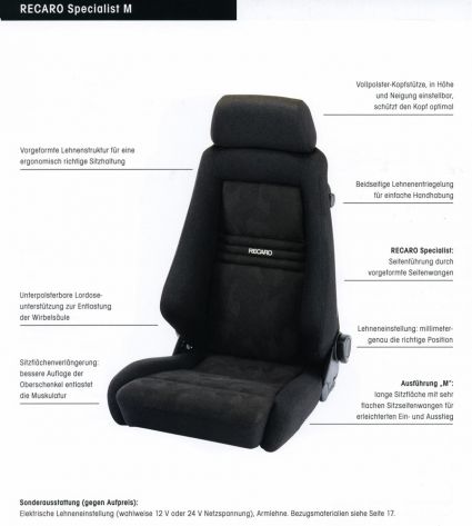 Der Einstieg in ergonomisches Sitzen - Ausführung "M".Wie der RECARO Specialist S ist auch der Specialist M mit einer vorgeformten Lehnenstruktur ausgestattet, die für eine ergonomisch richtige Sitzhaltung sorgt. Die lange und sehr flache Sitzfläche eignet sich besonders für mittelgroße bis große Personen, für Fahrer, die häufig ein- und aussteigen müssen und für Fahrzeuge mit hohem Ein- und Ausstieg (z.B. Geländewagen, Vans).
