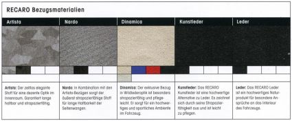 Qualität, Individualität und Vielfalt.Die Auswahl der zur Verfügung stehenden Stoffe, Leder- und Farbvarianten orientiert sich an unseren hohen Qualitätskriterien sowie der Innenraumgestaltung der Automobilhersteller. Dadurch wird gewährleistet, dass sich die Sitze problemlos in Ihr Fahrzeug integrieren. Die vielfältigen Kombinationen der RECARO Bezugsstoffe sorgen für eine optimale Anpassung an das Fahrzeug.